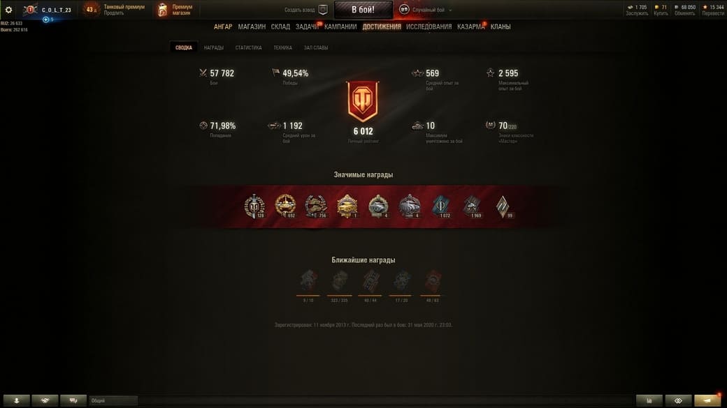🎌Количество боев: 58 000; 🏆Процент побед: 50%; 💰Количество кредитов: 106 тыс
